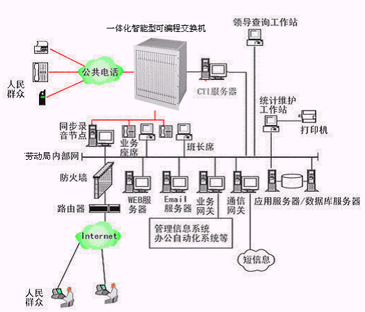 勞動(dòng)局多媒體呼叫中心系統(tǒng)主要是由智能型可編程交換機(jī)或帶語音板卡的工控機(jī)或排隊(duì)交換機(jī)、CTI服務(wù)器、IVR(交互式語音應(yīng)答)/IFR(交互式傳真應(yīng)答)子系統(tǒng)、人工座席子系統(tǒng)、應(yīng)用服務(wù)器、數(shù)據(jù)庫服務(wù)器、業(yè)務(wù)網(wǎng)關(guān)子系統(tǒng)、WEB服務(wù)器、電子郵件服務(wù)器、防火墻、通信網(wǎng)關(guān)等硬件設(shè)備和應(yīng)用軟件組成。