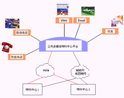客戶利用電話、傳真、電子郵件、因特網(wǎng)、手機、短消息等進入城市公共多媒體呼叫中心平臺,本系統(tǒng)依托現(xiàn)有各專業(yè)呼叫中心/使用城市公共多媒體呼叫中心平臺租賃服務的企事業(yè)單位的各類業(yè)務技術支持系統(tǒng)和網(wǎng)絡系統(tǒng),通過人工受理或自動語音服務等方式全天24小時不間斷地為客戶提供各種服務。