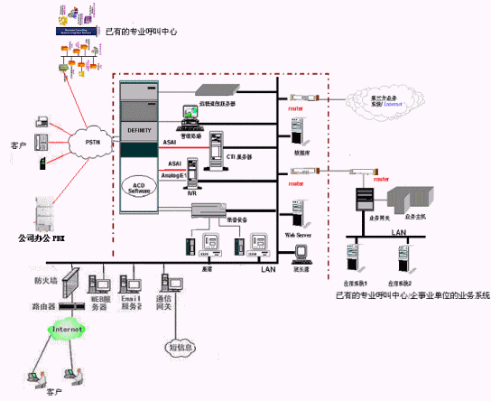 實現(xiàn)共享已有呼叫中心業(yè)務系統(tǒng)的資源:通過城域網(wǎng)或因特網(wǎng)實現(xiàn)與現(xiàn)有呼叫中心相關業(yè)務系統(tǒng)的連接與集成,諸如業(yè)務數(shù)據(jù)的提取等。一期工程僅僅留有相應的接口。