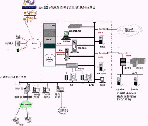 ·系統(tǒng)支持省-市-縣國(guó)家稅務(wù)局12366多媒體熱線系統(tǒng)的語(yǔ)音和數(shù)據(jù)聯(lián)網(wǎng); 提供完善的組網(wǎng)方案,實(shí)現(xiàn)資源共享,統(tǒng)一提供服務(wù)。