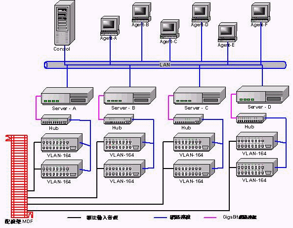 - 系統(tǒng)主要包括二大主機(jī)并由網(wǎng)絡(luò)聯(lián)機(jī)(TCP/IP協(xié)議)作為彼此與遠(yuǎn)程的溝通橋梁。一是錄音接口主機(jī)(VLAN-164)具備模擬輸入音源的匹配接口、音源數(shù)字化、網(wǎng)絡(luò)聯(lián)機(jī)輸出。一是數(shù)據(jù)庫(kù)服務(wù)器(DataBase