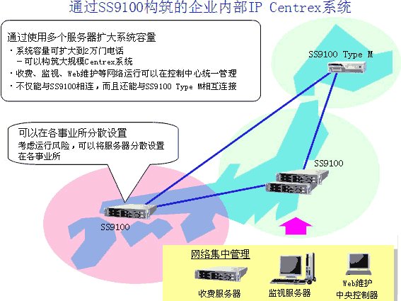 多個SS9100服務器相互協(xié)作,擴大了系統(tǒng)整體容量。以往模型由1個服務器構(gòu)成,系統(tǒng)最大只能容納5千門電話,而SS9100 R5可以構(gòu)筑將系統(tǒng)整體容量擴展到容納2萬門電話的大規(guī)模Centrex系統(tǒng)。進而,通過將服務器分散設(shè)置在各事業(yè)所的形式,可以考慮分散各事業(yè)所之間故障危險的基礎(chǔ)上構(gòu)筑系統(tǒng)。