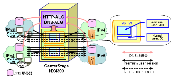 可以在ALG 服務器刀片上搭載將DNS咨詢進行IPv6-IPv4轉(zhuǎn)換的ALG功能。與轉(zhuǎn)換服務器刀片協(xié)作可以實現(xiàn)IPv6與IPv4的雙方向通信。