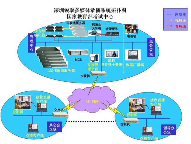 國家教育部考試中心為了對高考等大型考試實時性指導、監(jiān)考、培訓等,特建立了視頻會議系統(tǒng)、監(jiān)考系統(tǒng)。為了使整個系統(tǒng)更完善、應用價值更高,因此在此基礎上配置了銳取多媒體錄播系統(tǒng)。不僅實現(xiàn)了與各地考試中心及考點的圖像、語音和數(shù)據(jù)的交互通訊,還可以輔助系統(tǒng)完成視頻會議、監(jiān)考系統(tǒng)及培訓的錄制、直播和點播功能,錄制、直播和點播的內(nèi)容包括了所有考試中心、考點圖像以及聲音和數(shù)據(jù)信號。
