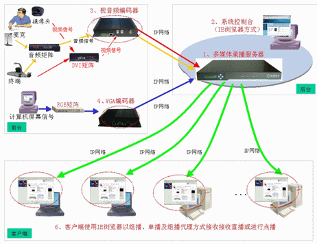通過服務(wù)器內(nèi)置單播或組播功能方式將會議現(xiàn)場的視頻、音頻、計算機屏幕上的圖像內(nèi)容和過程在網(wǎng)絡(luò)上進行實時直播,用戶可通過IE瀏覽器登錄服務(wù)器實時接收會議現(xiàn)場的視頻、音頻和計算機動態(tài)屏幕內(nèi)容,也可以選擇性的直播部分媒體流,直播延時小。同時系統(tǒng)獨家支持組播代理功能,無須更改網(wǎng)絡(luò)設(shè)備設(shè)置的即可實現(xiàn)跨網(wǎng)段的組播。