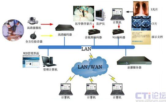 同時(shí),銳取多媒體系統(tǒng)前端VGA編碼器將采集到的計(jì)算機(jī)信號(hào)(包含通過(guò)網(wǎng)絡(luò)訪問(wèn)的DR/CR片、CT片)進(jìn)行實(shí)時(shí)編碼和壓縮,通過(guò)網(wǎng)絡(luò)與高清視音頻信號(hào)以及普通視音頻信號(hào)同步傳輸?shù)戒J取多媒體錄播系統(tǒng)遠(yuǎn)程醫(yī)療系統(tǒng)后臺(tái)服務(wù)器上。