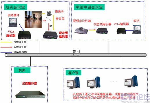 由于視頻會(huì)議系統(tǒng)沒(méi)有覆蓋公司內(nèi)所有的會(huì)議室,因此這些會(huì)議室召開(kāi)的會(huì)議就無(wú)法進(jìn)行直播,而借助于多媒體錄播系統(tǒng)就可以很好的解決這一缺陷。通常將這些會(huì)議室中的攝像頭和麥克風(fēng)接入到視音頻編碼器上,將講師電腦上的培訓(xùn)課件(如PPT,Word等文檔)內(nèi)容接入到VGA編碼器上,兩者將采集到的信號(hào)通過(guò)網(wǎng)絡(luò)發(fā)給錄播服務(wù)器,由錄播服務(wù)器進(jìn)行處理后直播到各個(gè)客戶端,就可以很方面的對(duì)于任意一個(gè)會(huì)議室召開(kāi)的會(huì)議進(jìn)行錄播,隨時(shí)隨地對(duì)員工傳達(dá)會(huì)議精神。