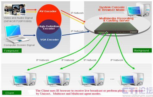銳取的多媒體錄播系統(tǒng)最基本的功能是可對可視化信息進(jìn)行錄制,直播與點(diǎn)播。系統(tǒng)采用基于IP網(wǎng)絡(luò)的分布式架構(gòu),有前臺的編碼器及后臺的服務(wù)器組成?蛻舳送ㄟ^計(jì)算機(jī)接收。