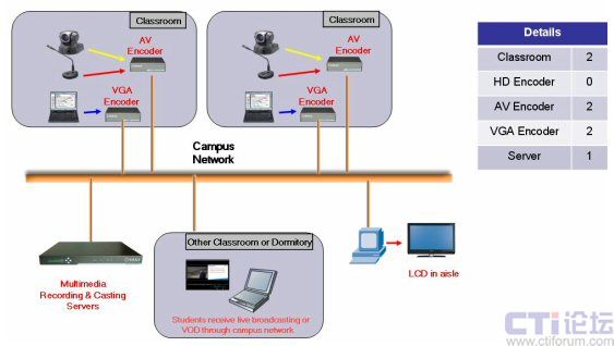 為了讓學(xué)生能更輕松地掌握課程內(nèi)容,學(xué)校的老師們希望可以有這樣一個系統(tǒng)可以將某個老師或?qū)<业闹v課內(nèi)容錄制下來,并能實(shí)時的傳到其它的教室,大堂,甚至學(xué)生的宿舍。而內(nèi)容必須包括老師的圖像及在電腦上播放的多媒體課件。通過這個系統(tǒng)學(xué)生可以隨時隨地的進(jìn)行到課程的學(xué)習(xí),構(gòu)建“無障礙學(xué)習(xí)校園”。