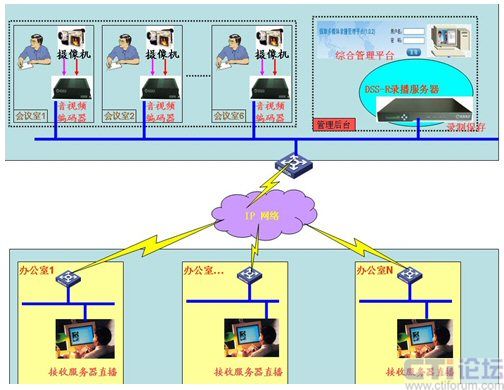 基于上述的需求,經(jīng)過調(diào)研選用深圳銳取錄播服務(wù)器產(chǎn)品完成上述的功能需求。如圖所示,通過放置在每個會議室考場內(nèi)的攝像機(jī),將竟聘者的圖像與聲音傳輸?shù)较噙B接的銳取公司的視音頻編碼器上,通過編碼器的編碼將采集的信號(通過內(nèi)部網(wǎng)絡(luò))傳輸?shù)胶笈_的管理平臺上的DSS-R錄播服務(wù)器中。服務(wù)器的直播模塊將從音視頻編碼器接收到的信號分發(fā)到網(wǎng)絡(luò)中,每個接入內(nèi)網(wǎng)絡(luò)的辦公室內(nèi)里的電腦通過專有客戶端接收考場實時內(nèi)容,實現(xiàn)了真正意義上的接受機(jī)關(guān)廣大干部群眾的監(jiān)督考察。同時錄播服務(wù)器內(nèi)置的錄制模塊,將收到的信號內(nèi)容解碼錄制保存(服務(wù)器內(nèi)有可供存儲的硬盤),為日后干部的選擇做到了有理可依,有據(jù)可查。