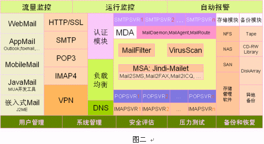 系統(tǒng)采用模塊化設(shè)計(jì)、具有良好的封裝性,使系統(tǒng)具有強(qiáng)大的擴(kuò)展性。郵件核心系統(tǒng)和郵件前端(Webmail)系統(tǒng)可以運(yùn)行在不同的主機(jī)上,可以將軟件的不同模塊,如收發(fā)模塊、用戶認(rèn)證模塊、郵件存儲(chǔ)模塊、用戶接入模塊等,分別運(yùn)行在不同的機(jī)器上,共同來完成整個(gè)電子郵件系統(tǒng)的功能。如果需要的話,每一種模塊還可以再拆分在不同的服務(wù)器上運(yùn)行,實(shí)現(xiàn)負(fù)載分擔(dān),因此系統(tǒng)可以根據(jù)需要和用戶的使用模式進(jìn)行定制。