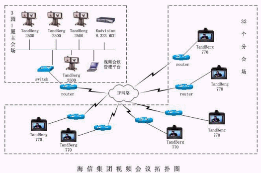 山東海信集團有限公司會議電視項目以海信大廈為中心,覆蓋各個省的35個分支機構(gòu)。充分利用自己網(wǎng)絡資源的優(yōu)勢,采用ITU(國際電聯(lián))的H。323標準。于-2004-年初經(jīng)過系統(tǒng)方案的征集、產(chǎn)品的反復測試,最終確定了由華夏科技代理的挪威TANDBERG的視頻終端,并于2004年6月份簽訂了一期采購合同,共計36套視頻終端。