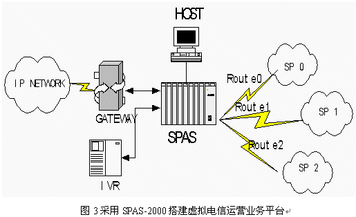 中國(guó)加入WTO后,國(guó)內(nèi)與國(guó)際的聯(lián)系、交流和溝通將會(huì)越來越頻繁,這一趨勢(shì)帶來了巨大的電信服務(wù)市場(chǎng)商機(jī)。同時(shí),國(guó)際電信企業(yè)正在尋求進(jìn)入中國(guó)的途徑,國(guó)內(nèi)新興的電信運(yùn)營(yíng)商積極應(yīng)對(duì)這種局面,而虛擬電信運(yùn)營(yíng)商也在國(guó)內(nèi)開始出現(xiàn)。如何爭(zhēng)取客戶是所有這些提供電信服務(wù)的企業(yè)共同面臨的課題。一個(gè)智能化的、高效的、靈活的、有特點(diǎn)并易于控制的服務(wù)平臺(tái)無疑是他們進(jìn)行競(jìng)爭(zhēng)的重要工具。由于SPAS-2000可編程交換機(jī)是一個(gè)全開放的靈活平臺(tái),用戶通過應(yīng)用程序幾乎可以完全控制交換,能很好的滿足用戶的需求。在此SPAS-2000可編程交換機(jī)上開發(fā)的電話批發(fā)及零售業(yè)務(wù)應(yīng)用,配合計(jì)算機(jī)技術(shù),能靈活控制業(yè)務(wù)的路由選擇、費(fèi)率計(jì)算并可提供個(gè)性化服務(wù),為運(yùn)營(yíng)商降低運(yùn)營(yíng)成本,提高服務(wù)質(zhì)量給出了有效的解決方案。例如一個(gè)IP電話運(yùn)營(yíng)商在全球互連中可能有多個(gè)合作伙伴,每個(gè)合作伙伴提供的服務(wù)也不相同,為了節(jié)省費(fèi)用并提高服務(wù)質(zhì)量,IP電話運(yùn)營(yíng)商需要根據(jù)時(shí)段、費(fèi)率、通話質(zhì)量、接通率等指標(biāo)智能選擇去話路徑。SPAS-2000可編程交換機(jī)提供編程開發(fā)接口,通過E1與IVR連接,在服務(wù)器上開發(fā)高層應(yīng)用軟件,可以實(shí)現(xiàn)多種高級(jí)功能。同時(shí)SPAS還可以連接各種型號(hào)的網(wǎng)關(guān)。應(yīng)用連接圖見圖3: