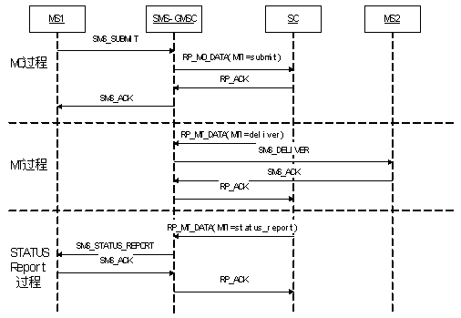 上圖是表示出了一個(gè)移動(dòng)臺(tái)MS1向另一移動(dòng)臺(tái)MS2發(fā)送短消息的典型過程,圖中忽略了MSC、HLR、BS等功能實(shí)體,重點(diǎn)說明的是MO、MT、StatusReport三個(gè)典型過程中,SMS-GMS與SC之間的消息序列。