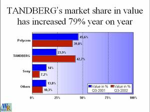TANDBERG視頻會議終端產(chǎn)品是挪威泰德集團(TANDBERG Group)下屬視訊公司(TANDBERG Telecom)的定位于高端市場的視頻會議系統(tǒng)終端產(chǎn)品,亦就是說,TANDBERG終端是挪威泰德公司專為出錢要買最好終端的客戶們設計、生產(chǎn)和制造的。TANDBERG未在挪威以外設立任何分廠,每臺設備必須經(jīng)過挪威工程師嚴格檢驗,從而保證每臺設備的最高可靠性(當然海關進口成本要高一些了)。TANDBERG全系列產(chǎn)品均采用泰德自己研發(fā)的專用視頻芯片,而不是采用第三方芯片加以集成,從而保證了從高端T8000至低端T500的所有產(chǎn)品性能表現(xiàn)均很優(yōu)秀。