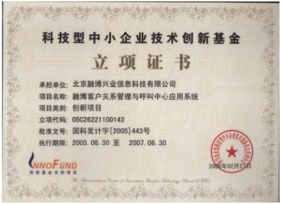 "融博客戶關(guān)系管理與呼叫中心應(yīng)用系統(tǒng)"喜獲國(guó)家里科技部2005年中小企業(yè)創(chuàng)新基金的立項(xiàng),以及中關(guān)村科技園區(qū)的創(chuàng)新基金!融博興業(yè)本次立項(xiàng)的產(chǎn)品是2005年北京地區(qū),乃至全國(guó)唯一獲得創(chuàng)新基金支持的CRM與呼叫中心應(yīng)用軟件項(xiàng)目。