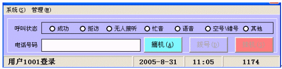 - 坐席功能,坐席人員通過電腦鼠標(biāo)操作,取新客戶資料,點(diǎn)擊撥號,同時(shí),用鼠標(biāo)操作記錄撥號過程和通話過程的一些設(shè)置(撥號成功、忙線、無人接、客戶反饋信息等)。坐席電腦將分類顯示忙線電話列表、無人接電話列表、感興趣客戶列表等信息,以便做下一輪撥號參考。