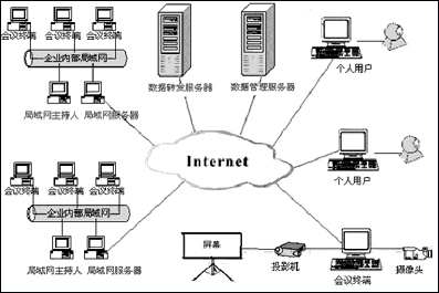 會(huì)議帶寬管理 可以設(shè)置會(huì)議所需要的網(wǎng)絡(luò)帶寬,當(dāng)客戶(hù)端連接到服務(wù)器后,將根據(jù)服務(wù)器設(shè)定的會(huì)議帶寬決定本地視頻采集的幀率。例如,如果服務(wù)器設(shè)定的會(huì)議帶寬為56Kbps,則所有連接到服務(wù)器的客戶(hù)端將以1~3幀/秒的幀率進(jìn)行視頻采集;如果服務(wù)器設(shè)定的會(huì)議帶寬為256Kbps,則所有連接到服務(wù)器的客戶(hù)端將以8~10幀/秒的幀率進(jìn)行視頻采集。由于上網(wǎng)條件與網(wǎng)絡(luò)環(huán)境的千差萬(wàn)別,設(shè)定固定的會(huì)議帶寬有利于保證會(huì)議的正常穩(wěn)定進(jìn)行(系統(tǒng)結(jié)構(gòu)如下圖所示)。