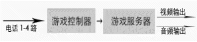 由于許多地區(qū),尤其是縣級市沒有信息平臺,而且許多電視臺愿與電話局直接合作。在這種情況下,電話局和電視臺合作對有線用戶公布 特服號碼,如123456,參與互動(dòng)游戲的用戶,統(tǒng)一撥打該號碼,電話局提供四條用戶線給互動(dòng)游戲系統(tǒng),同時(shí)對撥打123456的用戶都轉(zhuǎn)到這四條用戶線來,從而接入到互動(dòng)游戲系統(tǒng),由系統(tǒng)給出語音提示引導(dǎo)用戶參與比賽。由于系統(tǒng)最多允許四個(gè)人參與比賽,當(dāng)用戶滿時(shí),撥打游戲熱線的用戶