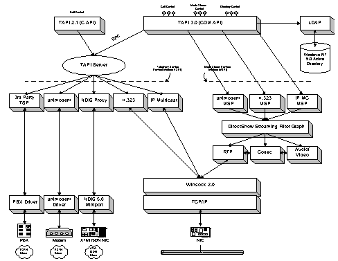 最新的TAPI 3.0基于微軟的COM標(biāo)準(zhǔn),它允許TAPI應(yīng)用程序采用包括JAVA?、Visual Basic?、Visual C++?在內(nèi)的各種語(yǔ)言進(jìn)行編寫,同時(shí)還可以方便的通過ActiveX技術(shù)將其移植到互聯(lián)網(wǎng)中去。TAPI除了支持傳統(tǒng)的電話應(yīng)用,還支持標(biāo)準(zhǔn)的H.323會(huì)議和IP多點(diǎn)會(huì)議,良好的QoS支持使得它增強(qiáng)了會(huì)議的質(zhì)量和網(wǎng)絡(luò)的可管理性。TAPI采用了統(tǒng)一的媒體流接口-DirectShowTM,TAPI媒體流提供商(MSP)只要針對(duì)不同的電話提供商(TSP)來(lái)實(shí)現(xiàn)DirectShowTM接口就可以被應(yīng)用程序使用。