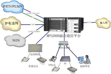 MPS2000融合通信平臺(tái)組網(wǎng)能力強(qiáng)大,能夠提供數(shù)字中繼、模擬中繼(包括環(huán)路中繼、二/四線中繼等各種模擬中繼)、IP中繼等硬件接口,在信令協(xié)議上支持NO.7、NO.1、Pri等信令以及H.323、SIP、MGCP等協(xié)議。平臺(tái)能夠與數(shù)字網(wǎng)、模擬網(wǎng)、數(shù)模混和網(wǎng)、IP電話網(wǎng)、NGN(下一代網(wǎng)絡(luò))等現(xiàn)有的各種網(wǎng)絡(luò)進(jìn)行組網(wǎng)。