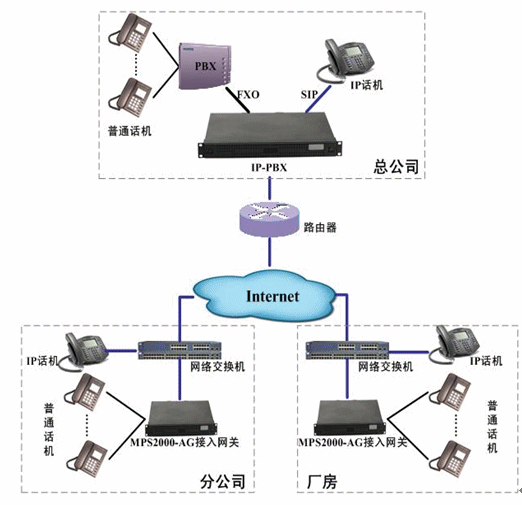 各分公司根據(jù)實際分機(jī)數(shù)配置相應(yīng)的接入網(wǎng)關(guān)或IP話機(jī)。接入網(wǎng)關(guān)和IP話機(jī)通過Internet注冊到位于總公司的IP-PBX上,實現(xiàn)了總部電話和分公司、廠房電話之間的通信、號碼直撥、來電顯示等功能。