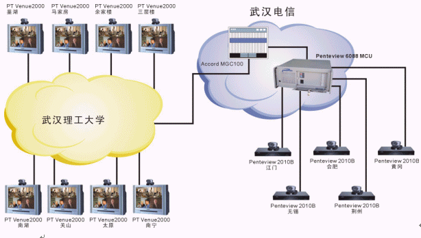 武漢理工大學(xué)的遠(yuǎn)程教學(xué)系統(tǒng)由于分3期建設(shè),網(wǎng)絡(luò)條件較為復(fù)雜。一期主要以PT的Venue2000終端+Accord MGC100 MCU為主,是一個(gè)H323系統(tǒng);二、三期采用中太多媒體的Penteview2010終端+Penteview6088MCU,是一個(gè)H320系統(tǒng),兩套系統(tǒng)通過(guò)網(wǎng)關(guān)無(wú)縫結(jié)合到一起工作,用戶根本感覺(jué)不到不同。各教室均同時(shí)采用了中太多媒體的遠(yuǎn)程教學(xué)支撐系統(tǒng),通過(guò)對(duì)Penteview會(huì)議電視系統(tǒng)的擴(kuò)充,實(shí)現(xiàn)了以下功能,使教學(xué)應(yīng)用更加方便: