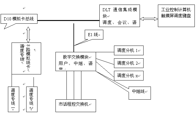 在DLT多路通通信系統(tǒng)平臺中,由于DLT通信集成模塊具有D10總線,可以和模擬環(huán)路用戶卡相連,實現(xiàn)直接用戶線功能,因而可克服上述兩種調(diào)度設備的不足,以滿足現(xiàn)代化生產(chǎn)的快速要求、廣域,智能化調(diào)度指揮要求。