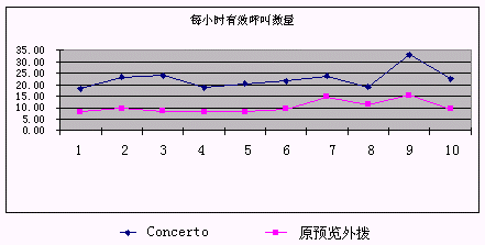 下圖可以看出使用原預(yù)覽外撥和采用Concerto預(yù)測(cè)外撥系統(tǒng)后單位座席每小時(shí)有效呼叫數(shù)量的比較: