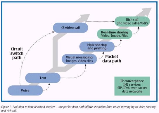 首個(gè)IP整合服務(wù)(例如視頻共享和內(nèi)容共享)是向豐富的通話方式發(fā)展的關(guān)鍵。這是一個(gè)以語音、視頻和文本為形式的基于會(huì)話通訊的概念,它支持在會(huì)話參與者之間共享相同的內(nèi)容,例如圖片、數(shù)據(jù)和其它增值信息。
