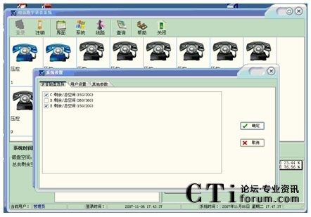 在系統(tǒng)操作控制區(qū) 選擇【系統(tǒng)】 , 系統(tǒng)彈出如下系統(tǒng)設(shè)置對話框,您將在系統(tǒng)設(shè)置對話框內(nèi)能看到【系統(tǒng)設(shè)置】頁: 【錄音磁盤選擇】選擇錄音文件存放的盤符; 如圖所示
