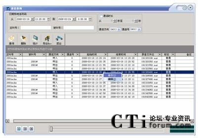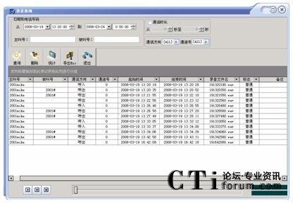 可按通道號,日期,時間,撥出/入電話號碼等多種方式進(jìn)行單個和組合查詢,查詢方便快捷,數(shù)據(jù)表的下邊還顯示出數(shù)據(jù)資料的統(tǒng)計。并可根據(jù)通話內(nèi)容及聯(lián)系人等重要信息對錄音文件進(jìn)行編輯。可以任意播放一個錄音或選擇多個錄音依次播放,放音時將彈出當(dāng)前語音文件的放音進(jìn)度等信息。