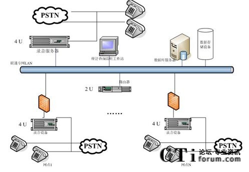 用戶需要建設(shè)一套“分布錄音,集中管理”的電話錄音系統(tǒng),在中心點有16個坐席,總計各縣有11點網(wǎng)點,每網(wǎng)點有8個坐席(項城16個)。中心和各網(wǎng)點之間用聯(lián)通的專網(wǎng)連接。用戶需要在聯(lián)通專網(wǎng)上進(jìn)行數(shù)據(jù)傳輸。