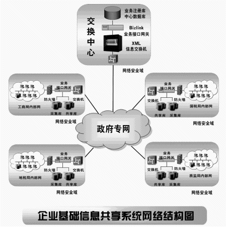 (1) 通過企業(yè)基礎(chǔ)信息交換與共享系統(tǒng)將不同的政府部門辦公網(wǎng)絡(luò)連接在一起,形成資源共享,消除孤島現(xiàn)象;