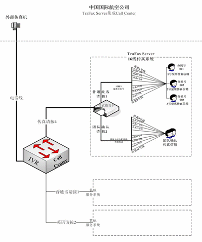 與國航Call Center集成后的TraFax Server系統(tǒng)共有16條傳真線路,其中一半專門用作接收普通旅客發(fā)來的傳真,另外8條線路則是為受理團體客戶的傳真確認而設(shè)。二者不同是,普通客戶在向國航發(fā)送傳真的過程中需要根據(jù)系統(tǒng)提示音在發(fā)送前的最后環(huán)節(jié)中輸入明確的坐席分機號碼,以使傳真文件發(fā)向分機號對用的坐席傳真信箱中,以此實現(xiàn)坐席人員對旅客的一對一式服務(wù),從而提高服務(wù)水平。而團隊確認的傳真無需輸入坐席分機號,傳真將被空閑的線路直接發(fā)送到一個專門的團隊確認傳真信箱中,從而確保國航對該類傳真的快速處理能力。目前,16線的TraFax Server已經(jīng)徹底的解決了國航的海量傳真問題,中國國際航空股份有限公司正在一個全新的平臺上向旅客提供著更加高效、更加便捷的人性化服務(wù)。