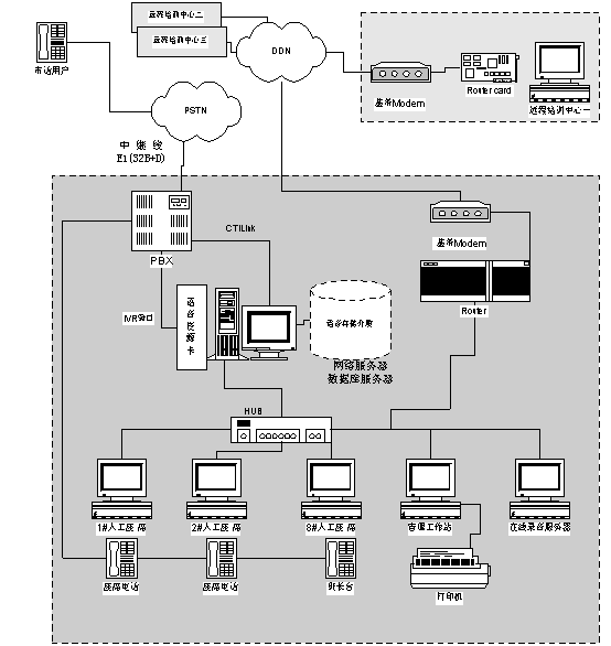 北京強(qiáng)訊恒通網(wǎng)絡(luò)技術(shù)公司通過(guò)利用該學(xué)院現(xiàn)有的計(jì)算機(jī)局域網(wǎng),根據(jù)該學(xué)院業(yè)務(wù)需求專(zhuān)門(mén)為800服務(wù)熱線設(shè)立了一組服務(wù)座席,每個(gè)座席都有座席電腦。所有撥打800熱線的電話(huà)通過(guò)CTI服務(wù)器的ACD系統(tǒng)分配到服務(wù)組最適合的座席。如該服務(wù)組暫時(shí)沒(méi)有空閑座席,則語(yǔ)音提示用戶(hù)等待并播放音樂(lè),一旦有座席空閑則自動(dòng)將該用戶(hù)電話(huà)轉(zhuǎn)接到空閑座席。當(dāng)有外線進(jìn)來(lái)接通到某個(gè)座席時(shí),系統(tǒng)自動(dòng)彈出該電話(huà)用戶(hù)的客戶(hù)資料。