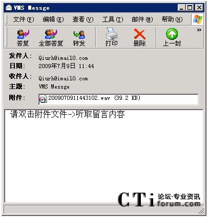 A、電子郵件檢索:語音留言可以以Email方式,發(fā)送到信箱主人的郵箱中,用戶可以使用Outlook、Foxmail或其它郵件方式,以附件方式收取個人的語音留言,通過PC上的揚聲器、耳機來收聽消息。