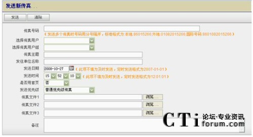 B、客戶端發(fā)送傳真:在客戶端選擇發(fā)送傳真文件,可以將文件定時發(fā)送至某一用戶或發(fā)送至用戶組(用于批量發(fā)送傳真);