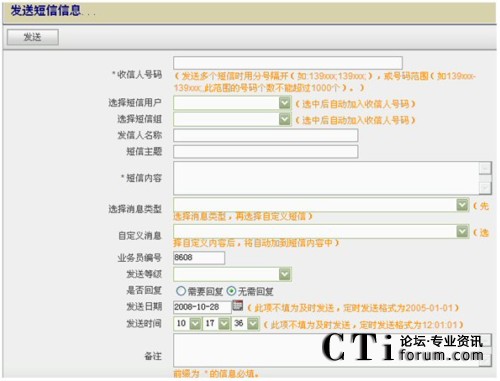 - 群發(fā)短信:通過個人的Web方式的客戶端給系統(tǒng)預(yù)先設(shè)置好的用戶組或?qū)懭攵鄠對方手機號碼發(fā)送短信;