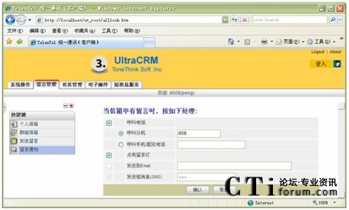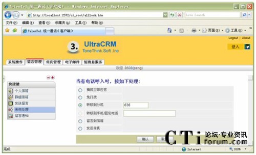 信箱主人通過Web方式的客戶端,根據(jù)實際需要,將來話設(shè)置為轉(zhuǎn)接到不同的目標,如:語音信箱留言、內(nèi)部其它分機、轉(zhuǎn)移至手機、轉(zhuǎn)移至外線;