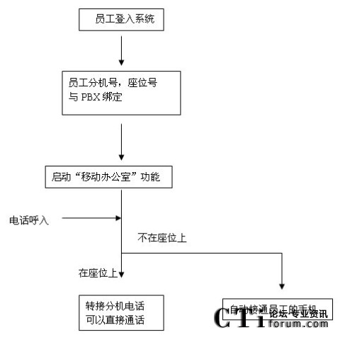 每個需要到企業(yè)辦公的員工,可以通過門禁系統(tǒng),或?qū)iT一臺PC上進行登入,通過后由系統(tǒng)自動分配或員工選擇一個空閑的座位,座位號與員工的分機號碼綁定,所有對這個員工分機的呼叫均被自動轉(zhuǎn)移到其座位上的辦公電話上;