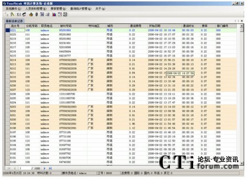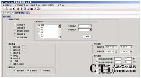 系統(tǒng)提供多種查詢條件,進行話單明細和話單結(jié)算的統(tǒng)計,如:按分機、部門、密碼、職員名稱、出現(xiàn)號碼、通話時間范圍、通話費用范圍、制定主叫、制定被叫、不同的通話類型(國內(nèi)長途、國際長途、市話、IP等)。
