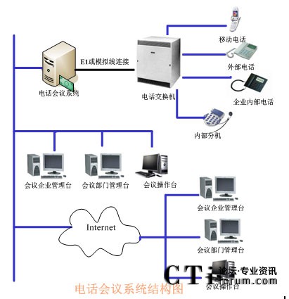 TalenTel CNF電話會議系統(tǒng)可以與程控交換機配合使用,也可以直接與局方的系統(tǒng)進行連接,系統(tǒng)的構(gòu)成含如下幾部分:TalenTel CNF電話會議系統(tǒng)服務(wù)器(ctsIVR)、會議企業(yè)管理員模塊、會議部門管理員模塊、會議操作員管理模塊、數(shù)據(jù)庫等組成。