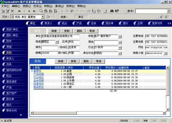 客戶單位的分類較聯(lián)系人的分類更復(fù)雜。常用的分類有:按照企業(yè)規(guī)模來分類(大、中、小,層次自定義,下同)、按照該客戶與本單位的緊密程度分類(緊密、普通、疏遠(yuǎn))、按照該客戶的重要性分類(重要、普通、次要)、按照該客戶的忠誠(chéng)度分類(忠誠(chéng)、普通、游移)。有一些用戶企業(yè),希望對(duì)客戶單位特征進(jìn)行采集,進(jìn)而進(jìn)行客戶信用評(píng)價(jià)。信用特征的類別可以多達(dá)數(shù)十種類(詳細(xì)情況可參考有關(guān)書籍)。利用SynleadCRM,您可以為每個(gè)類指定系數(shù),為類下屬的每個(gè)評(píng)價(jià)指定評(píng)分分值。例如,您可以建立一個(gè)類別為"客戶倉(cāng)庫(kù)積壓商品的情況",系數(shù)為1,該類別下屬的評(píng)價(jià)有"很多1分"、"一般3分"、"少1分"、"未知0分",如果指定某客戶該類別的評(píng)價(jià)為一般,則該項(xiàng)目得分為3分*1(系數(shù))=3分。依此類推,您還可以指定更多的分類與評(píng)價(jià),例如:客戶經(jīng)營(yíng)場(chǎng)所所處的位置、客戶在企業(yè)生命周期中所處的位置、客戶在行業(yè)中的地位、客戶產(chǎn)品的組合情況、客戶產(chǎn)品覆蓋的市場(chǎng)范圍、客戶產(chǎn)品的淡旺季規(guī)律、客戶近年?duì)I業(yè)額的增減趨勢(shì)、客戶的年度營(yíng)業(yè)額、客戶的現(xiàn)金周轉(zhuǎn)能力、客戶的負(fù)債情況、客戶是否涉及中大訴訟等。每一個(gè)類別項(xiàng)目的評(píng)分經(jīng)過系數(shù)的加權(quán)運(yùn)算后,可以求和,得到這個(gè)客戶的總評(píng)分。未來也可以利用分析模型對(duì)此類數(shù)據(jù)進(jìn)行進(jìn)一步的分析,提供輔助決策所需要的圖表和報(bào)表。