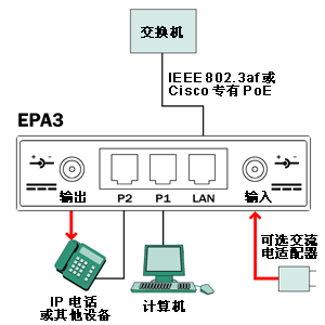 EPA3 與 IEEE 802.3af 標(biāo)準(zhǔn)以太網(wǎng)供電 (PoE) 以及 Cisco 專有的嵌入式電源兼容。EPA3 采用 PoE 作為輸入,并將它轉(zhuǎn)換為直流輸出到帶電源插座的電纜上。使用