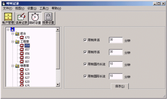 當(dāng)前,商路通實(shí)時(shí)計(jì)費(fèi)系統(tǒng)可以根據(jù)每一個(gè)分機(jī)、話務(wù)類型進(jìn)行實(shí)時(shí)控制?梢葬槍(duì)每一種話務(wù)類型(來話、市話、國內(nèi)長途、國際長途)設(shè)置不同的通話時(shí)長限制,時(shí)間一到立刻拆掉。