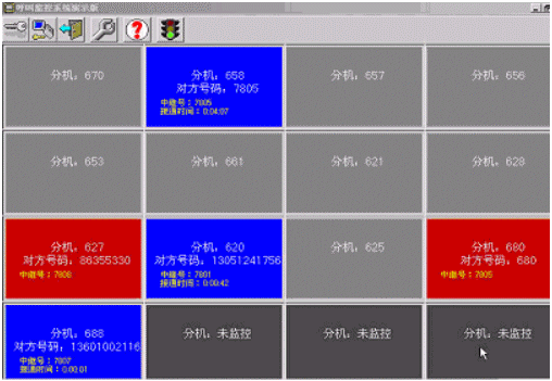 呼叫實(shí)時(shí)監(jiān)控功能實(shí)現(xiàn)了實(shí)時(shí)顯示每一個(gè)分機(jī)摘機(jī)、呼叫、通話掛機(jī)的狀態(tài),以便管理者實(shí)時(shí)、動(dòng)態(tài)了解當(dāng)前內(nèi)部通信網(wǎng)絡(luò)的狀況和每一個(gè)分機(jī)或員工的工作狀態(tài)。