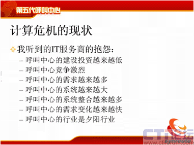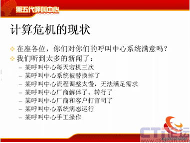 呼叫中心現(xiàn)在已經(jīng)了比較嚴(yán)重的計算危機(jī),我聽到了很多,因?yàn)槲抑攸c(diǎn)是在搞技術(shù)這一行當(dāng),我就問一個問題,在座的各位,你們對你們的呼叫系統(tǒng)滿意嗎?我相信大部分人可能嘴上都說比較滿意,但是很多人對深層次的矛盾都非常清楚,為什么不滿意?