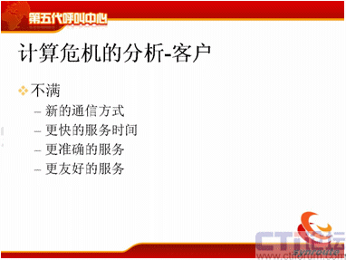 現(xiàn)在我們就分析一下后果,這時候計算危機(jī)的分析對于客戶來說,新的通訊方式我們都需要,可是呼叫中心沒有公布,我無法使用,更快的服務(wù)時間,大家看到了,比如說Web Chat,目前我點(diǎn)擊了80%是直接進(jìn)入留言的頁面,也就是說這時候沒有人工來服務(wù)了,或者是等待時間非常非常長,一個小時以后告訴我,排隊(duì)已經(jīng)到了,已經(jīng)沒有人能為我服務(wù)的,服務(wù)時間是根本沒有辦法保證的。第三個方面我們要更準(zhǔn)確的服務(wù),電話打進(jìn)去以后告訴我的信息和網(wǎng)絡(luò)告訴我的信息是完全不一樣的呢?為什么呢?因?yàn)樗闹R庫沒有關(guān)聯(lián)起來,業(yè)務(wù)流程沒有關(guān)聯(lián)起來,這種更友好的服務(wù),考核的指標(biāo)都是一樣的。