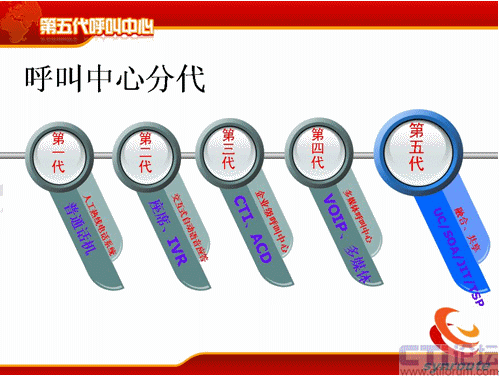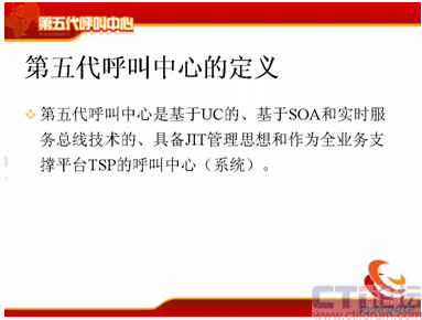 第五代呼叫中心的定義比較簡單,第五代呼叫中心是基于UC的,基于SOA和實(shí)時服務(wù)總線技術(shù)的,具備JIT管理思想和作為全業(yè)務(wù)支撐平臺TSP的呼叫中心系統(tǒng)。